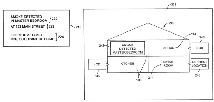 A estas alertas sobre un incendio le tenemos que añadir una alerta visual sobre la situación en la que se encuentra el edificio, el foco del incendio, número de calle, etc.Esto lo podemos ver en otro de los dibujos presentados con la patente mediante el cual vemos el dibujo de la casa en la alerta y una leyenda del detector que a detectado humo, la dirección de la casa y el número de personas que hay dentro.
