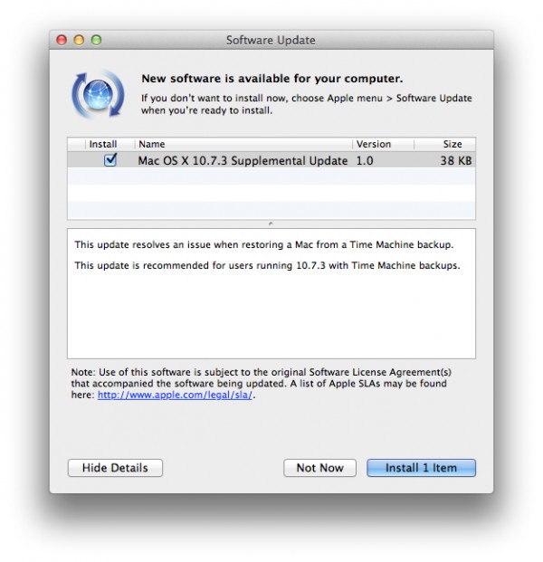 Soluciona un problema al restaurar el Mac desde una copia de seguridad de Time Machine. Apple recomendó la actualización para los usuarios con copias de seguridad de Time Machine que ejecuten la versión de OS 10.7.3.