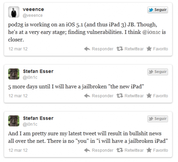 Stefan Esser, hace 5 días vía Twitter confirma que va a tener un Jailbreak para “El nuevo iPad”, conocido por el Jailbreak untethered de iOS 4.3.3, este hacker también es conocido por engañar varias veces con el Jailbreak falso para iPad 2 “Elevat0r” y un falso exploit en una aplicación que le coló a Apple en la App Store “iOn1c”. Aunque da a entender que no lo va a compartir. Si es cierto, ya que este hacker nos ha engañado varias veces, parece que tiene en sus manos un exploit para dispositivos con el micro A5X.
