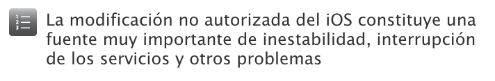 Entre los problemas que Apple advierte, están la inestabilidad del sistema operativo (iOS) cuando tenemos esta modificación en nuestro dispositivo iOS, una menor velocidad de transmisión de datos, posibles riesgos de seguridad y la reducción de la vida de nuestra batería.