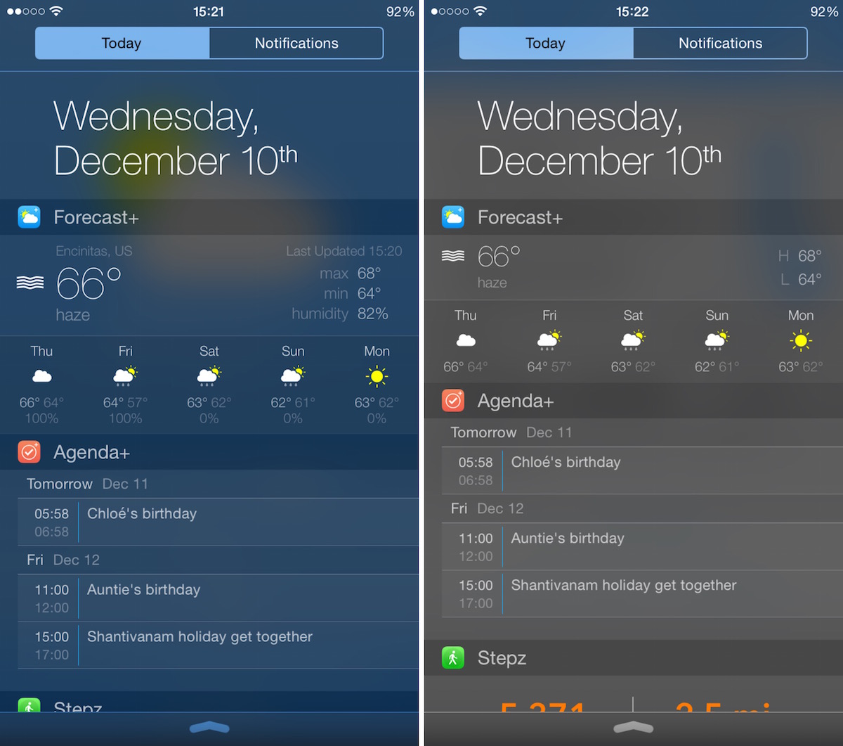 Si la cosa más importante que ves en el centro de notificaciones con la pantalla bloqueada, esta app es la que más te interesa. Viene con cuatro widgets diferentes para que puedas mantener una «vigilancia» sobre todos los días, cada hora y las condiciones climatológicas en todo el mundo. El widget de todo el mundo te permite elegir lugares específicos y te permite cambiar a diferentes unidades de temperatura. Puede incluir información detallada para la humedad, precipitación, punto de rocío, y más. El pronóstico de hora muestra predicciones meteorológicas exactas que cubren las siguientes 12 horas. El pronóstico de cinco días le dará una idea de lo que el resto de la semana se verá así. Puede ajustar cada widget para personalizar la vista hoy y ver exactamente lo que quieres.
