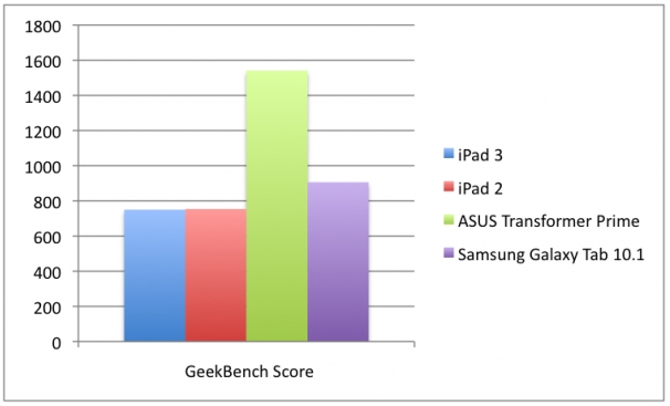 Los datos de benchmark también nos ofrecen que supera con facilidad al Tegra 3 y al A5 del iPad 2, siempre que no fuerce el procesador con la resolución mostrada en la Retina Display. Por lo que esta superioridad se da si en los test no se usa la pantalla.Se han realizado tres pruebas, la primera GeekBench para la potencia de la CPU, la segunda GLBenchmark para gráficos con pantalla y la tercera GLBenchmark sin hacer uso de la Retina Display. Empezamos: