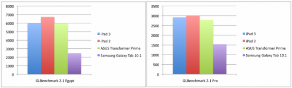 Para el test GlBenchmark con pantalla: el iPad 2 6709 fotogramas a 1024×768 pixeles, 59 fotogramas por segundo. El Nuevo iPad 5974 fotogramas a 2048×1536, 53 fotogramas por segundo. El Asus Transformer 5955 fotogramas a 1280×800, 52 fotogramas por segundo.