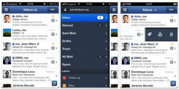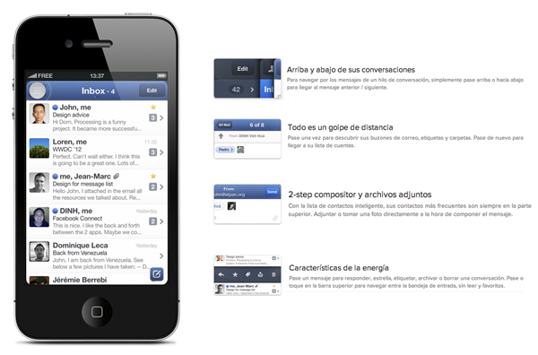 Después de ver su interfaz, puedo decir que es muy parecida a la de su compañero para Mac, tiene la integración de Facebook para gestión de fotos y la asignación de estas en los correos al más puro estilo de Twitter o Fousquare. Esta aplicación viene dispuesta a competir con el cliente oficial de correo para iPhone e iPad, no sabemos si tendrá la aceptación que su compañera de escritorio, pero podemos decir que promete.