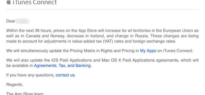 Ayer todos los desarrolladores con Apps en la App Store publicadas, recibieron un email como el que se puede ver en la imagen diciéndoles que los precios de las apps iban a subir en las próximas 36 horas y así ha ocurrido hoy mismo en todas las apps de todas las tiendas de Apple (Mac App Store, iTunes Store, App Store,…)
