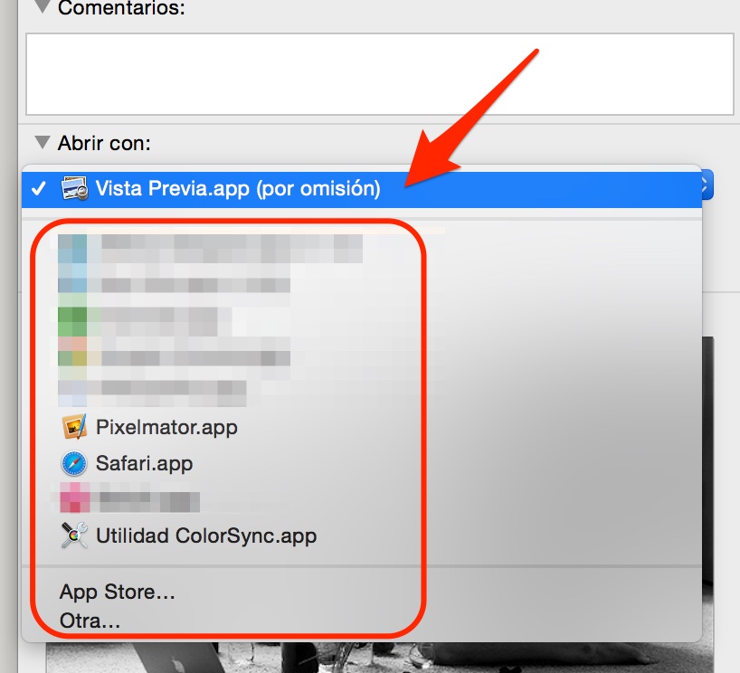 3.- Si queremos cambiar la aplicación por defecto (por omisión) para abrir este tipo de archivos (JPEG según el ejemplo), hay que seleccionar la nueva aplicación de la lista desplegable del apartado “Abrir con:”. Aquí veremos solo las aplicaciones capaces de abrir ese tipo de archivo. Quiere decir, que no veremos aquí listadas aplicaciones que no son capaces de abrir, en este caso, un archivo de imagen.